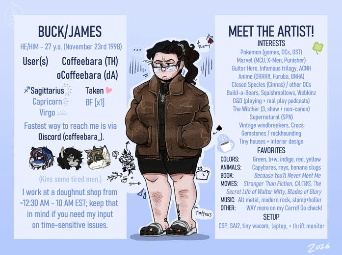 Welcome to one of my tiny pockets of this familiar hellscape broadly known as "The Internet".The name's James, though you may know me as Buck, Remi, Phish, or even Audrey.Some of my Meet The Artist info is now out of date, but the right column is generally the same! Chat with me about my interests and we'll be close in no time, I'm sure.